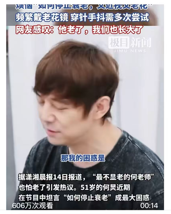 51岁的何炅近期在节目中坦言,近年精力大不如前,背台词需反复查看,“如何停止衰老”成最大困惑。自称现在特别痛苦,又近视又老花,他录制《大侦探》时频繁戴老花镜,《向往的生活》中穿针手抖需多次尝试,真的想哭,还自曝因超45岁被密室逃脱场馆拒绝入场。