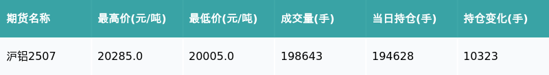 南财智讯6月11日电,南财金融终端盘后期货数据显示,上海期货交易所的沪铝主力合约收涨1.25%,收盘报20250.0元/吨通联随配,日内资金流入2.59亿元。其他相关指标见下表: